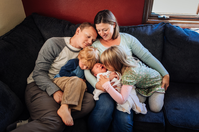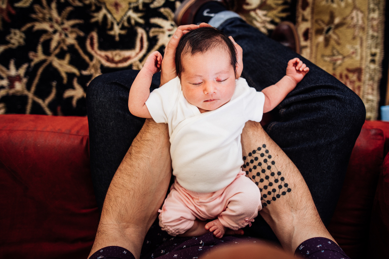 The style of photography you see on my website is called lifestyle photography. It’s unposed or lightly posed and I focus on the love surrounding baby’s arrival. For example, I won’t tell you how to snuggle your new baby on the couch, but I will suggest the couch as a spot to snuggle if I notice it has beautiful light.
