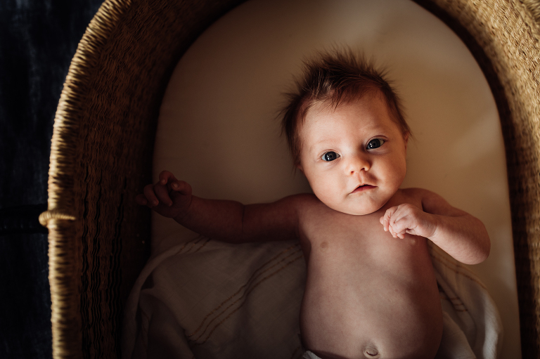 Timing with lifestyle photography is much more flexible than with posed. My ideal is to have the session in the first 2 weeks (before baby acne hits), but the babies on my website are anywhere from hours old to about 6 weeks old. The older the baby is the more awake/alert they typically are. If you are really hoping baby will sleep in the pictures, earlier is better.